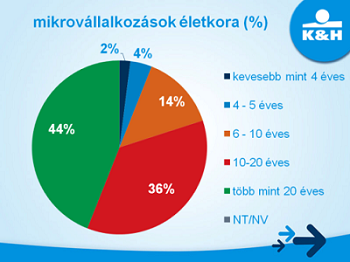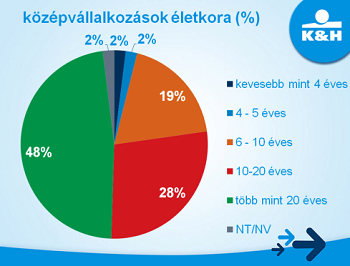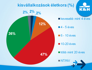 A K&H 500 hazai kkv megkérdezésén alapuló felmérése szerint a cégek zöme már túl van a korai gyermekkoron. „A vállalkozások legnagyobb része, 41%-a a húszas éveit tapossa. Közel ugyanilyen arányban (39%) vannak azok, amelyek több mint tíz éve működnek. Minden hetedik vállalkozás már elérte az iskolás, azaz a 6 éves kort, míg ennél fiatalabb cégekkel csak elvétve találkozhatunk (5%). A hazai kkv szektor tehát nagyrészt stabil, viszonylag komoly múlttal rendelkező cégekből áll” – részletezte az eredményeket Kovács Viktor Zoltán.
