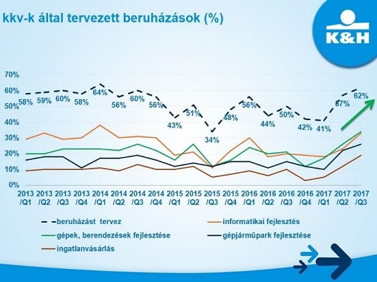 Az év eleji alacsony arányt követően folyamatosan javul a hazai kkv-k beruházási kedve. „Jelenleg 10-ből 6 cég gondolja úgy, hogy valamilyen fejlesztésbe kezd a következő egy év során. Ez jelentős előrelépés az egy évvel ezelőtti értékhez képest, amikor 10-ből 5 cég vélekedett így. A javulás mindenképpen örvendetes, hiszen három és fél éve nem volt ilyen magas a beruházási szándék. A fogyasztás dinamikus bővülése és a folyamatosan megjelenő uniós pályázatok pedig hozzájárulhatnak a fejlesztések szinten maradásához vagy akár további emelkedéséhez is. Nemrég jelent meg például a kkv-k eszköz- és szoftverbeszerzésre irányuló 17 milliárd forintos keretösszegű pályázat” – mondta el Kovács Viktor Zoltán, a K&H kkv marketing főosztály vezetője.