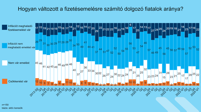 Összességében a többség, az érintettek 74 százaléka vár tehát emelkedést. Ez az eredmény a felmérés 2013 óta íródó történetében a legjobbak közé tartozik, bár nem rekord: a csúcsérték éppen nemrég, 2023 második negyedévében született, akkor 80 százalékos volt a fizetésemelésre számítók aránya.