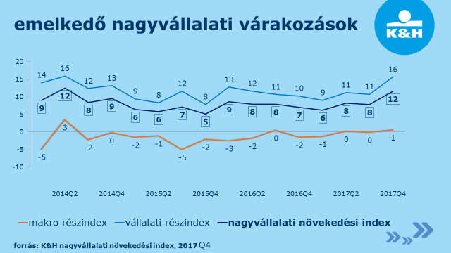 Hároméves csúcsot ért el a hazai, 2 milliárd forint feletti éves árbevételű, nem-állami nagyvállalatok egy évre előretekintő várakozásait mutató K&H nagyvállalati növekedési index. „A mutató 2017 negyedik negyedéves eredménye 12 ponton áll, ami 4 pontos növekedés az előző negyedévhez képest. A kedvező tendencia leginkább annak tudható be, hogy saját cégük tervezett idei aktivitását nagyon kedvezően ítélik meg a vállalati döntéshozók. Számszerűsítve ez azt jelenti, hogy a vállalati részindex 5 pontos növekedésnek köszönhetően 16 ponton áll, miközben a makrogazdasági környezet változását mutató makro részindex gyakorlatilag stagnált, jelenleg 1 ponton áll” – mondta el Patrick Van Overloop, a K&H Üzleti ügyfelek divízió vezetője.