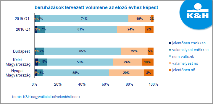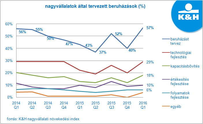 2016 első negyedévének beruházási adatai ugyan még nem ismertek, az idei évre nézve a K&H nagyvállalati növekedési index első negyedéves eredményei alapján elmondható, hogy meredeken megugrott a nagyvállalati szektor beruházási hajlandósága. „Jelenleg a hazai nagyvállalatok több mint fele (57%) tervez fejlesztést megvalósítani a következő egy év során, ami az elmúlt két évet nézve az eddigi legmagasabb arány. Emellett legalább ilyen fontos, hogy a vállalatok elmondása alapján várhatóan a beruházásokra fordítandó összegek is növekedni fognak a tavalyi évhez képest” - tájékoztatott Peter Roebben, a K&H Vállalati üzletágának vezetője.
