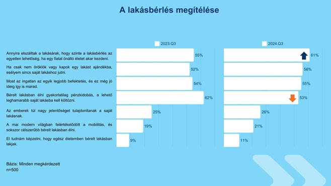 A kutatás alapján a megkérdezettek 26 százaléka szerint túl nagy jelentőséget tulajdonítanak az emberek a saját lakásnak. Aki bérelt ingatlanban lakik, 39 százalékban gondolja ezt, míg a nem bérelt lakásban élők körében ez az arány csak 24 százalék. Kiderült továbbá, hogy a középkorúak több mint ötöde - 21 százaléka - a bérelt lakás nyújtotta mobilitást tartja fontos tényezőnek. Tény, hogy a felmérésben szereplők közül bérelt lakásban mindössze 13%-uk lakik.