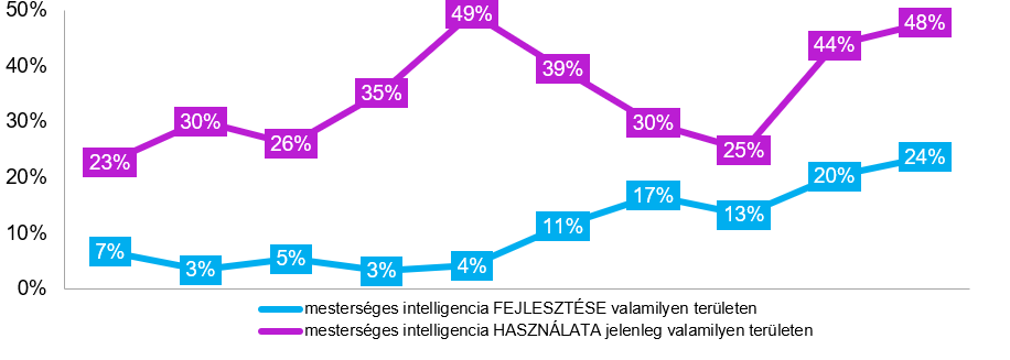 A mesterséges intelligencia fejlesztésének és használatának aránya is tovább emelkedett. A vállalatok körében az AI-t aktívan használók aránya 44-ről 48 százalékra nőtt, miközben azoknak a cégeknek az aránya, amelyek kifejezetten AI-fejlesztéseket futtatnak vagy bevezetés alatt álló projekttel rendelkeznek, elérte a 24 százalékot – ez a kutatás eddigi legmagasabb értéke.