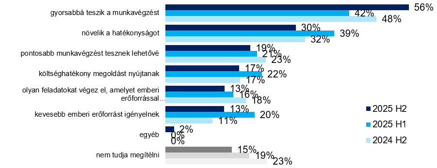 A kutatás szerint a cégvezetők körében egyértelműen erősödött az a vélekedés, hogy az AI legfontosabb üzleti előnye a munkavégzés felgyorsítása. Bár sokan továbbra is a hatékonyságnövelést és a költségcsökkentést tartják meghatározónak, a gyorsaság előtérbe kerülése arra utal, hogy a vállalatok rövid megtérülésű, az azonnal használható MI-megoldásokat részesítik előnyben.