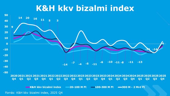 Év végére jelentősen javultak a hazai kkv-szektor várakozásai – derül ki a K&H kkv bizalmi index 2025 negyedik negyedévében végzett kutatásából, amely 400 hazai kis- és középvállalkozás válaszai alapján mutatja be a szegmens gazdasági várakozásait. A bizalmi index értéke az előző két negyedévhez képest 10 ponttal emelkedett, így jelenleg -4 ponton áll.