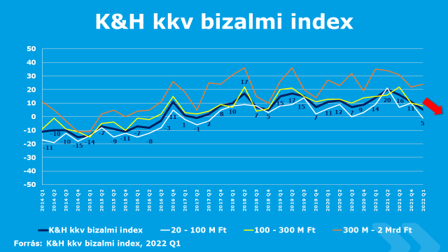 Hat pontos csökkenés után is pozitív tartományban maradt a K&H kkv bizalmi index, amely a mikro-, kis- és középvállalkozások várakozásait vizsgálja, azonban 5 pontos értéket négy éve, 2018 utolsó negyedévében vett fel utoljára. A visszaesés hátterében a magas infláció áll, amelynek híre már az ukrán-orosz konfliktus kirobbanása előtt ismert volt. A lekérdezés közvetlenül a konfliktus kitörése előtt kezdődött és az azutáni két hétben zajlott, amikor a kkv-k feltehetően még nem építették be várakozásaikba annak - esetleges hosszú távú - hatásait.