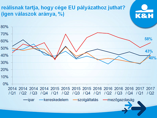 Ha a különböző ágazatokat nézzük, viszonylag egységes kép rajzolódik ki az uniós pályázati esélyeket illetően. Továbbra is az agrárcégek tartják a legvalószínűbbnek, hogy uniós támogatáshoz jussanak (58%), de jelentős javulás figyelhető meg a kereskedelmi és a szolgáltató cégeknél is. Előbbieknél mintegy 15 százalékponttal 43%-ra, utóbbiaknál 11 százalékponttal 40%-ra nőtt azon cégek aránya, akik reálisnak tartják uniós forrás elnyerését. Az iparban ez az arány nem változott (40%) az előző negyedévhez képest.