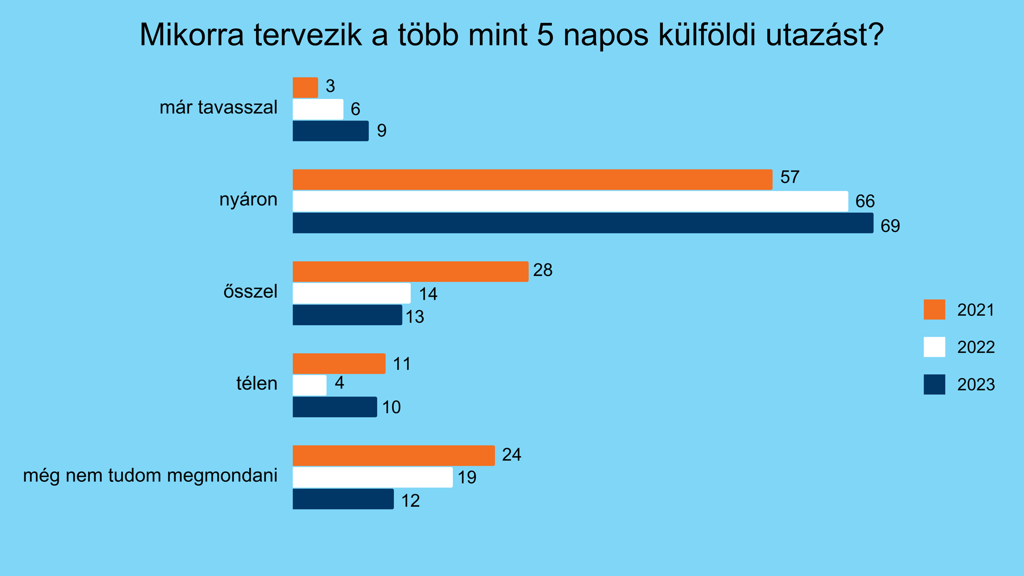 A K&H első negyedévben ismétlődő jelleggel végzett kutatása szerint a 30-59 évesek hatoda tervez legalább ötnapos külföldi utazást az idén. A tavalyi évhez hasonlóan nagy többségük - 69 százalékuk - elsősorban a nyári hónapokban utazna külföldre. Emellett 9 százalékuk már az első negyedévben is letudta ezt az utazást, míg 10, illetve 12 százalékuk a harmadik vagy a negyedik negyedévben kerít sort rá, esetleg ismételten is.