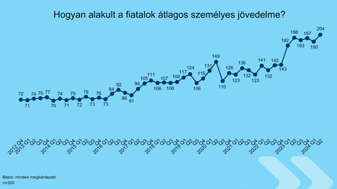A friss eredmények szintlépést mutatnak: az idei második negyedévben ugyanis a megkérdezettek esetében az átlagösszeg 204 ezer forintot tett ki, azaz a kutatás történetében most először haladta meg a 200 ezer forintos szintet. A jövedelemmel rendelkező fiatalok esetében – akik közel 90 százalékot tesznek ki – 231 ezer forint lett az átlag, a főállású alkalmazottakat 309 ezer forintos összeg jellemzi, a minimálbér feletti fizetéssel rendelkezők pedig átlagosan 360 ezer forintról számoltak be.