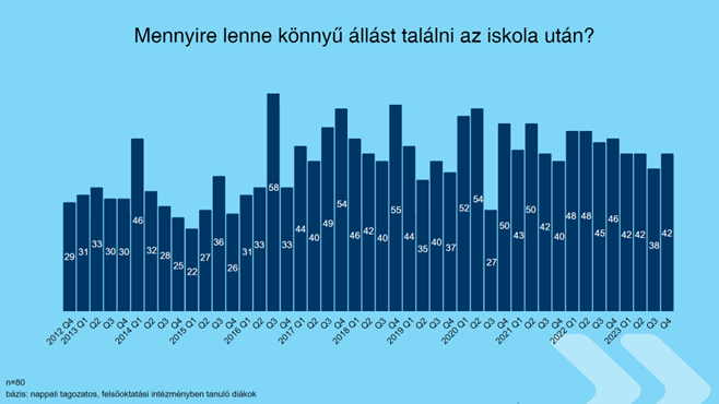 A nappali tagozaton tanuló egyetemisták 42 százaléka mondta azt, hogy inkább könnyen vagy nagyon könnyen fog állást találni az iskola után: ez ugyan 4 százalékponttal jobb a július–szeptemberi időszak adatánál, de hosszabb időtávon nézve inkább átlagos értéknek számít. Ezzel együtt voltak negyedévek, amikor az érintettek nagyjából fele, 48-50 százaléka volt ezen a véleményen, de például 2020 és 2022 elején még az 50 százalékot is elérte a bizakodók aránya.