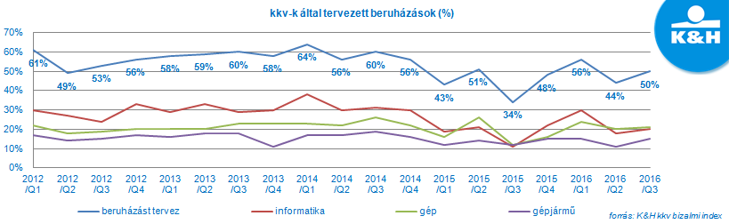 Az év közbeni zuhanást követően megugrott a kkv-k beruházási hajlandósága, jelenleg a cégek fele tervez valamilyen fejlesztést – derül ki a K&H kkv bizalmi index kutatás legutóbbi adataiból. A célokat tekintve a gépek, berendezések beszerzése áll az élen, megelőzve a sokáig elsőbbséget élvező informatikai fejlesztéseket. Leginkább az agráriumban és a középvállalkozásoknál számíthatunk beruházásokra a következő egy év során.