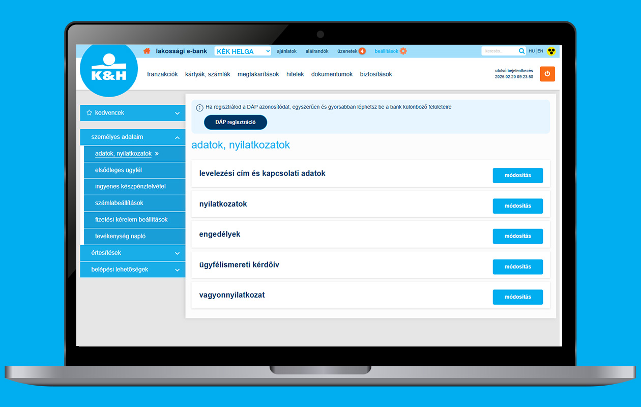 a K&H e-bank felületén a beállítások menüpont alatt találod a DÁP regisztráció gombot – erre kattintva indul a folyamat, ha nem látod a gombot, akkor már korábban sikeresen regisztráltad a DÁP azonosítódat