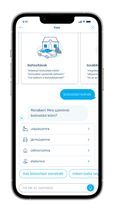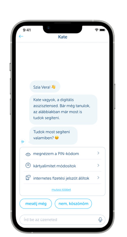 Kate-nek „új ügyfél vagyok!” és már intézi is beállításaid igényeid szerint, például digitalizálja kártyád, beállítja a vásárlási limited és persze válaszol felmerülő kérdéseidre is. Innentől már mindig rendelkezésre áll saját asszisztensed 0-24-ben!