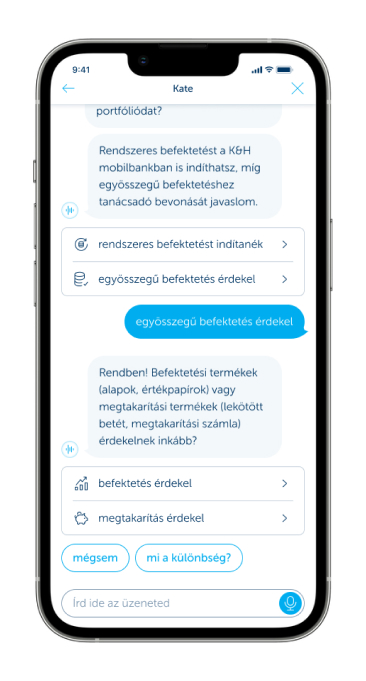 Kate a K&H mobilbankodban elérhető, valódi digitális pénzügyi asszisztens- beszéddel vagy chat alapon is kapcsolatba léphetsz vele