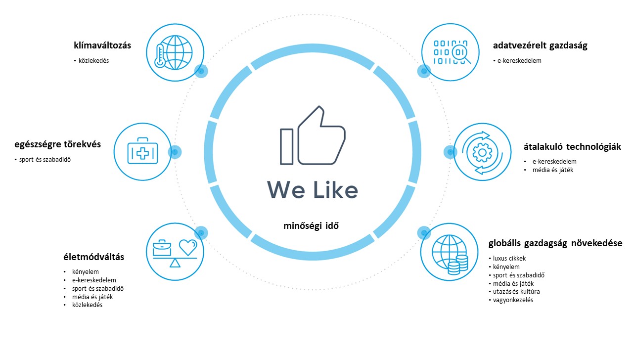 - a növekvő szabadidő, és annak minőségi eltöltéséből profitáló cégek részvényeibe fektet