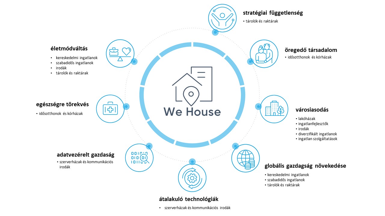 - az urbanizáció, a középosztály ingatlanbefektetései, az elöregedő társadalom speciális igényei, az átalakuló fogyasztási szokásokhoz kapcsolódó ingatlanbefektetések tartós keresletet eredményeznek a minőségi, korszerű ingatlanok iránt