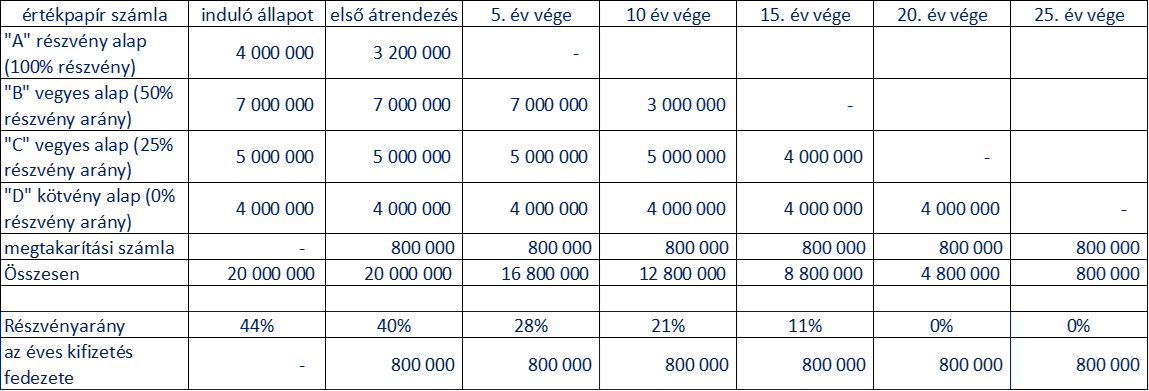 A táblázatban látható, hogy a részvénykitettség folyamatosan csökken és az éves kifizetések fedezete a portfolió elemeinek eladásából a megtakarítási számlán rendelkezésre áll. A táblázatban nem szerepelnek hozamok, de a való életben egy 15-20%-os átlagos részvénykitettség mellett azért szép hozam keletkezhet, ami folyamatosan növelheti az éves kifizetéseket.