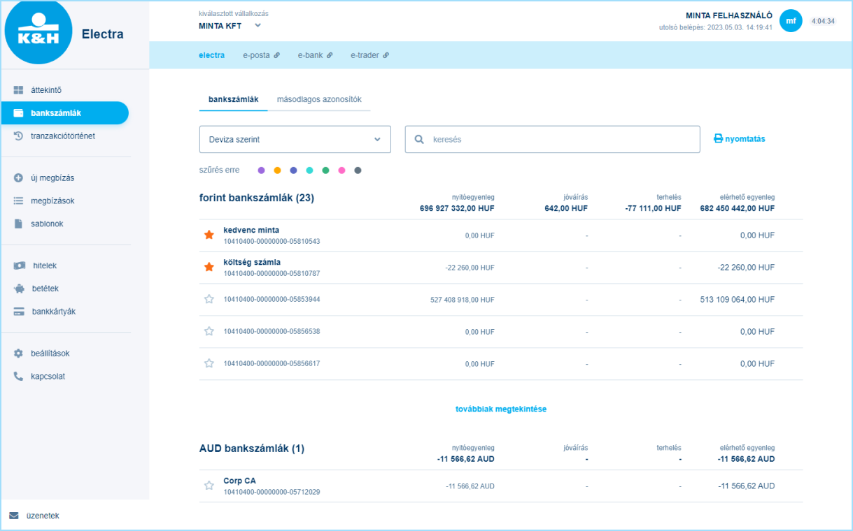 Főbb adatok a kezdőoldalon láthatóak, de a bankszámlára kattintva láthatóak további részletek, illetve a kapcsolódó tranzakciótörténet, alapértelmezetten az elmúlt 30 napra vonatkozóan. A hivatalos K&H e-postában lévő kivonathoz is innen lehet átnavigálni. Itt rögzíthető a másodlagos azonosító is.