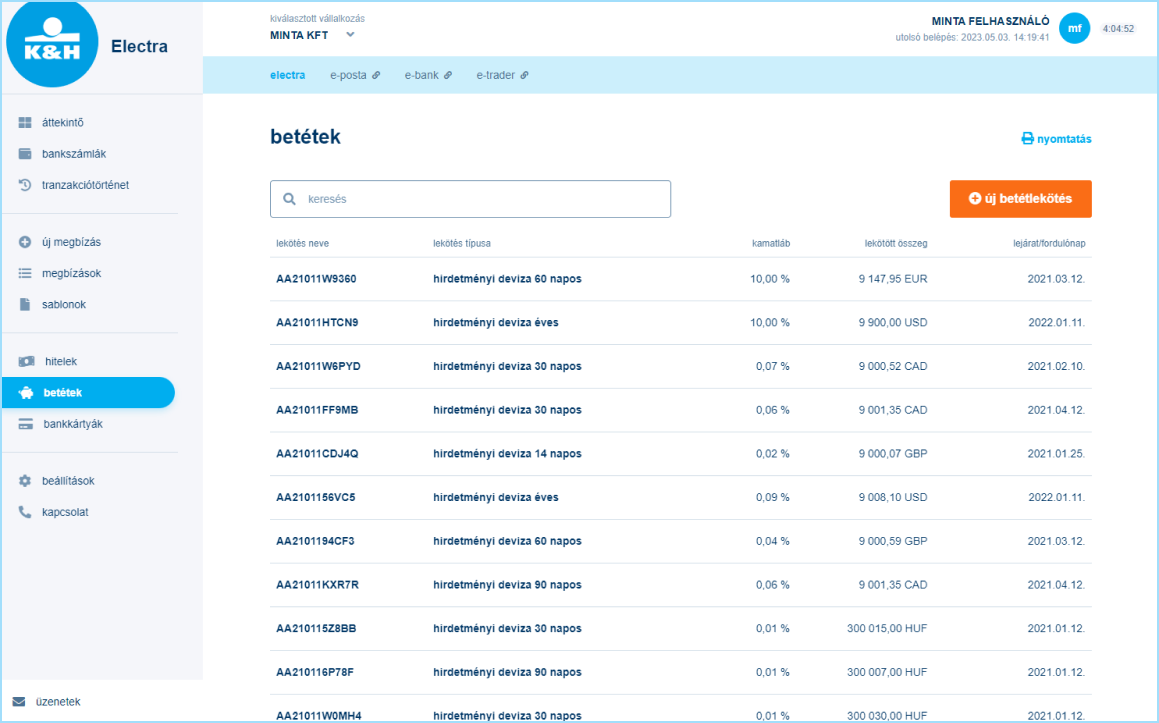 Új lekötést a jobb felül található ’új betétlekötés’ gombra kattintva tud indítani, ahol a kitöltést itt is sablonok és lenyíló mezők segítik. Adott betétre kattintva a megnyíló új oldalon jobb felső sarokban található gombra kattintva tudja felmondani.